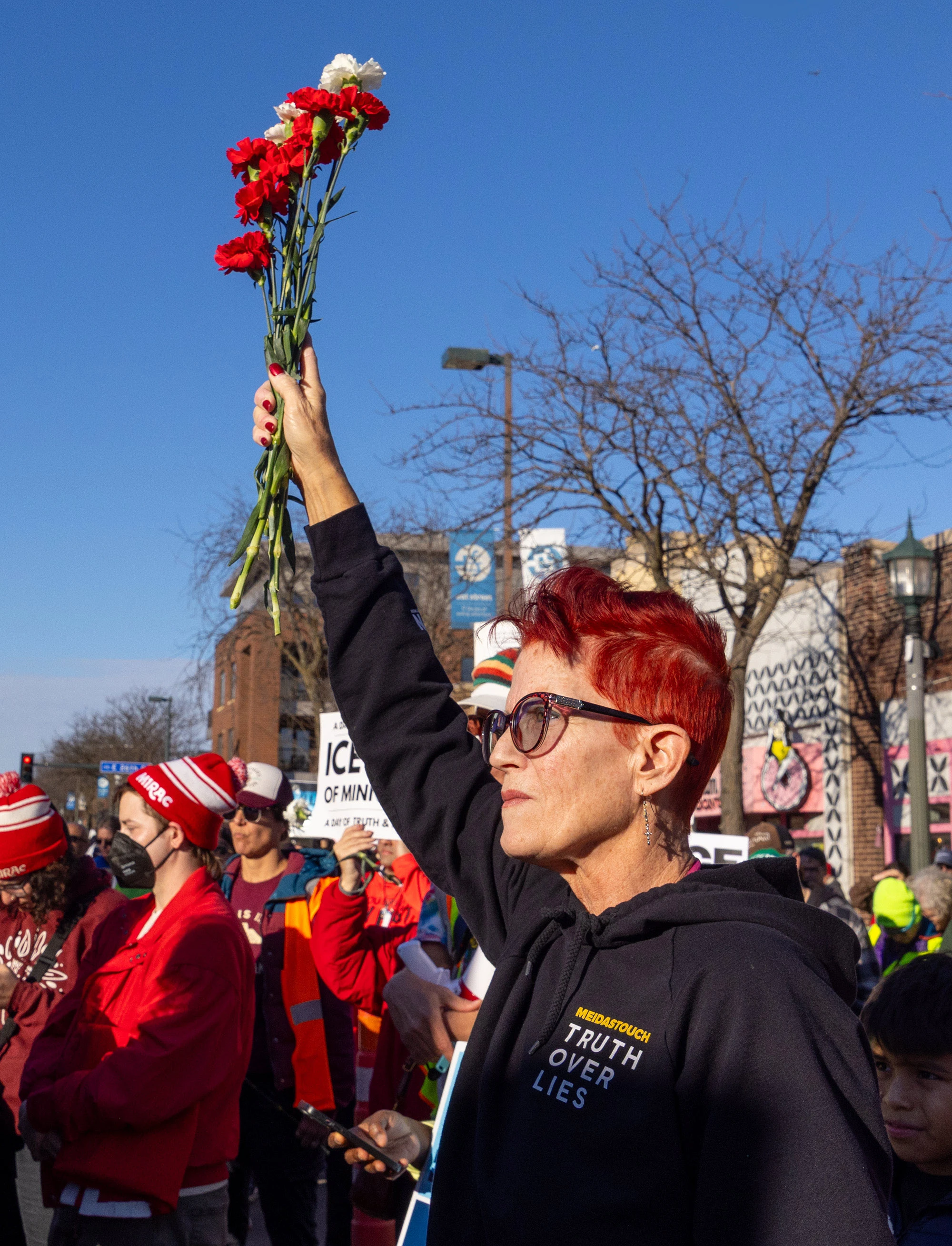 A woman stands in the late afternoon light on Nicollet Avenue at a vigil for Alex Pretti, arm raised high with carnations clenched in her fist. Red carnations for grief. Red for anger.